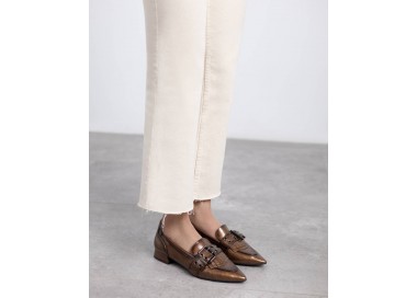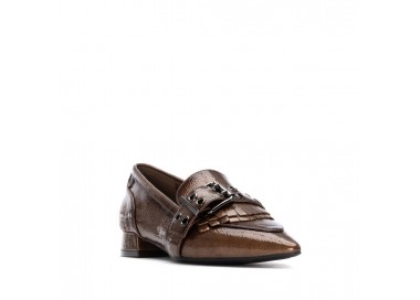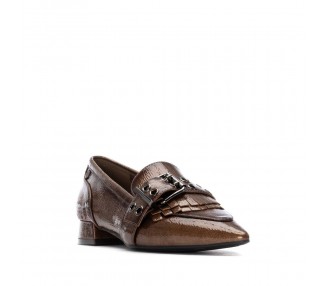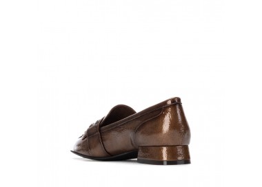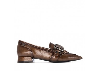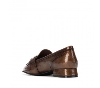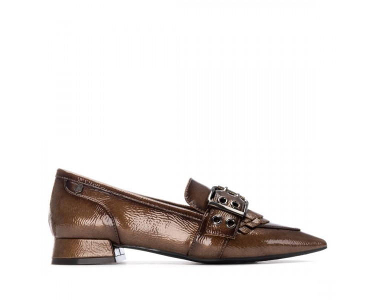 Zapato mocasín de mujer y joven, realizado en charol de primera calidad muy suave. Adorno en pala de hebilla decorativa en color plata vieja y flecos al tono. El forro y la plantilla son de material técnico. Tacón Forrado al tono. Suela de goma antideslizante y plantilla extraíble.