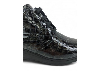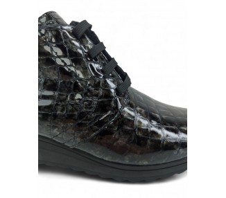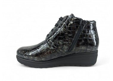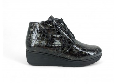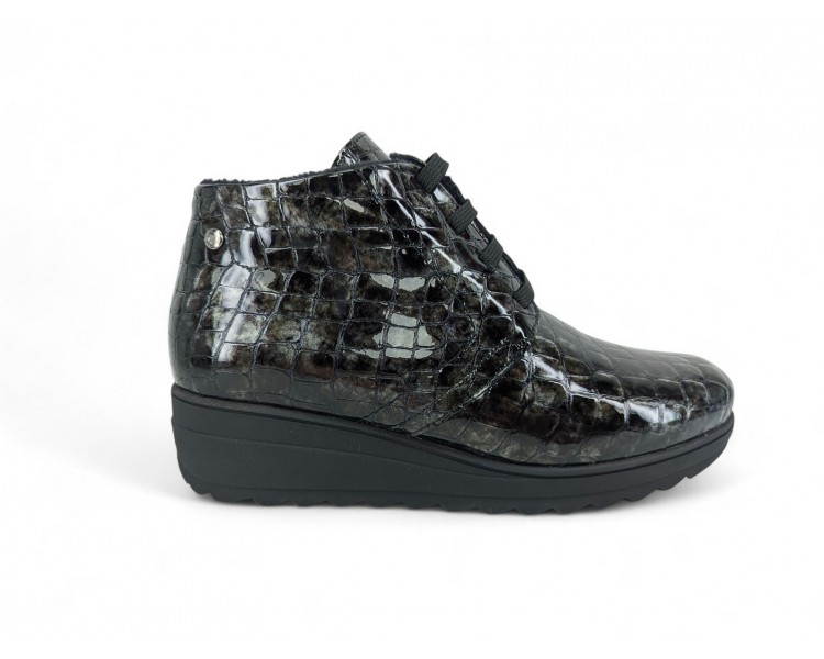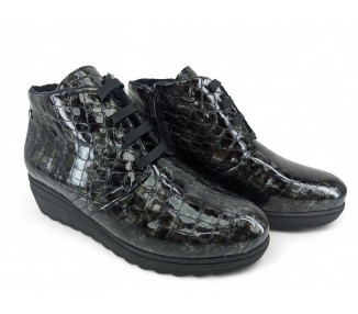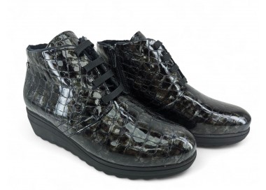 Bonito y cómodo botín de señora con cuña cómoda, realizado en piel charol efecto coco muy muy suave. Forro textil afelpado con pelito de primera calidad y piso goma antideslizante. Cierre mediante cordón central para un perfecto ajuste al pie y también cuenta con cremallera practicable por la parte interna. Fabricados en España por la marca Kaola.