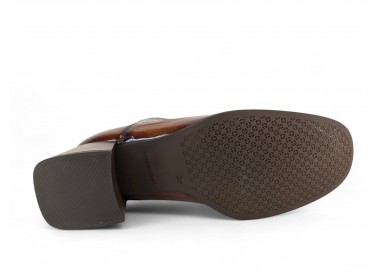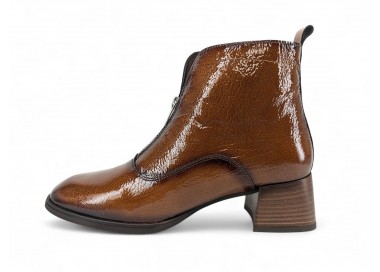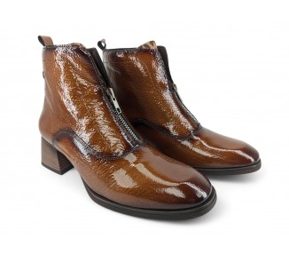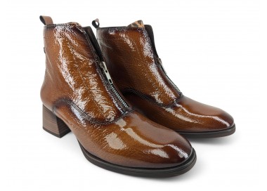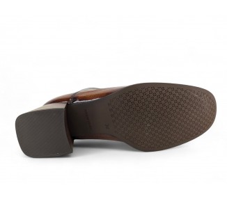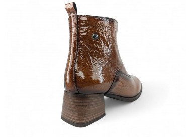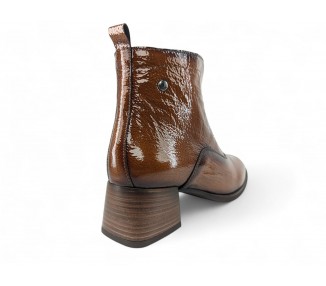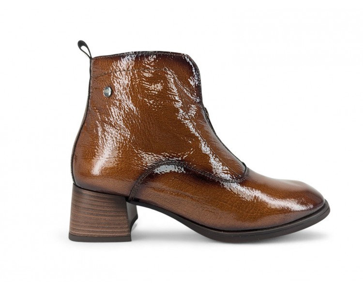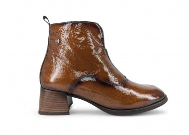Bonito y cómodo botín de señora con tacón, realizado en piel charol muy muy suave. Forro textil afelpado y piso goma antideslizante. Cierre mediante cremallera central. Puntera cuadrada. Degradación de color en costuras. Lengüeta animal print leopardo. Hechos en España por la marca Kaola.