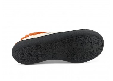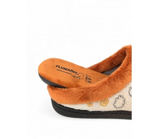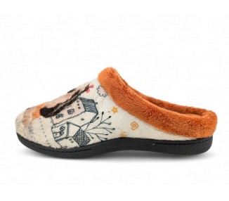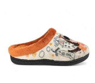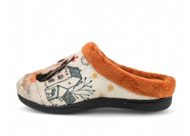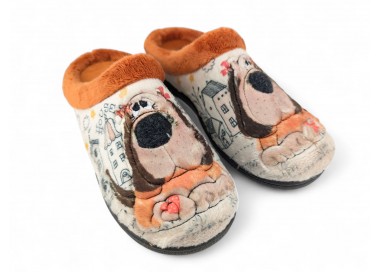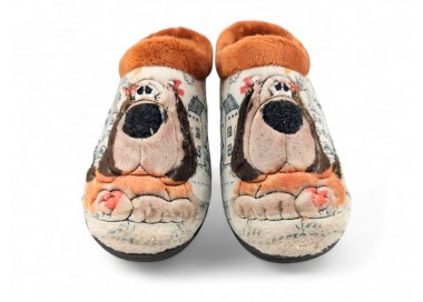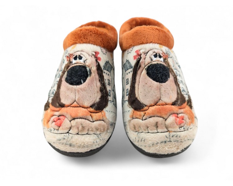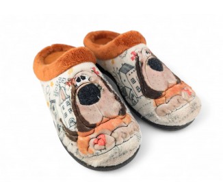 Comodísima zapatilla descalza de andar por casa para niña y mujer, realizada en material textil con dibujo de perro con fondo de casas y nubes. Forro y ribete de pelo. Tiene plantilla extraíble de espuma de PU transpirable de alta recuperación que se adapta completamente a la anatomía del pie. Fabricado en España por la marca Plumaflex.