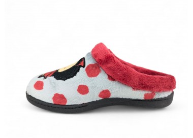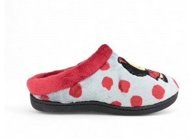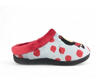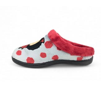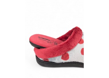 Comodísima zapatilla de andar por casa cerrada para mujer. Realizada en textil muy suave y aterciopelado con motivo de corazones y mensaje "love". Forro textil afelpado y suela flexible y antideslizante. Plantilla muy acolchada. Fabricado en España por la marca Gema García.