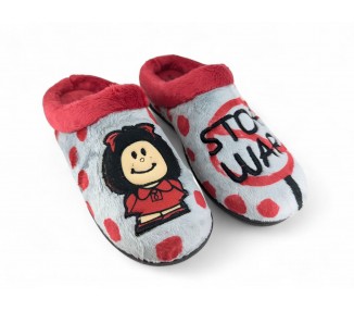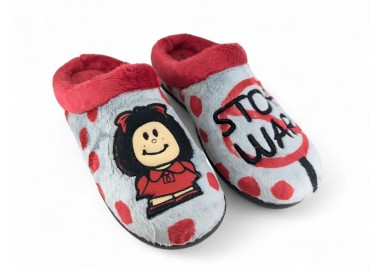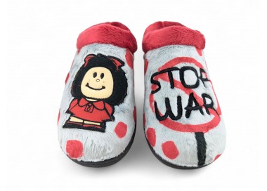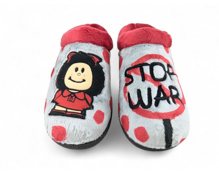 Comodísima zapatilla descalza de andar por casa para niña y mujer, realizada en material textil con dibujo de silueta de Maffy en un pie y mensaje de "Stop War" en el otro pie. Forro y ribete de pelo. Tiene plantilla extraíble de espuma de PU transpirable de alta recuperación que se adapta completamente a la anatomía del pie. Fabricado en España por la marca Plumaflex.