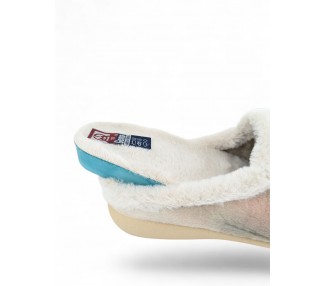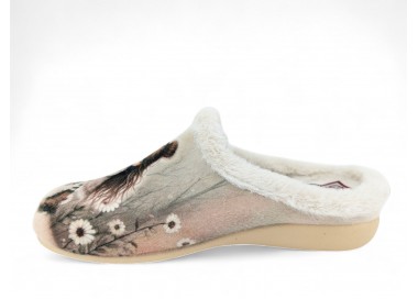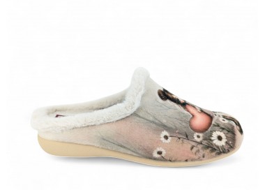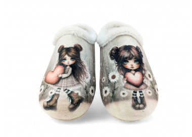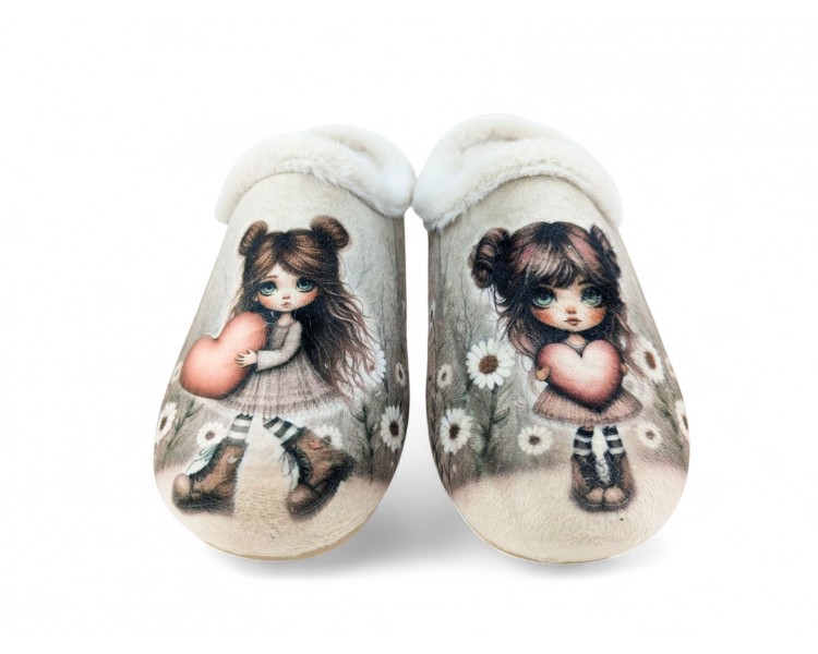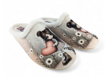 Comodísima zapatilla de andar por casa descalza para mujer y joven. Realizada en textil muy suave y aterciopelado con forro textil afelpado y suela flexible y antideslizante. Ribete de pelo. Motivo en pala de chicas con corazón y fondo de flores. Plantilla extraíble. Fabricado en España por la marca Gema García.