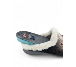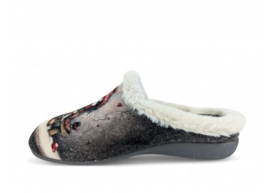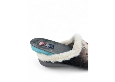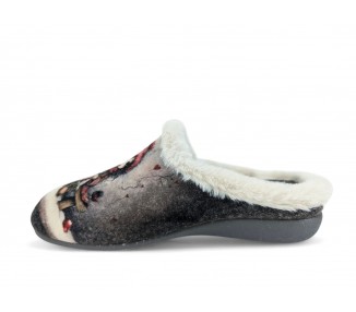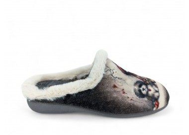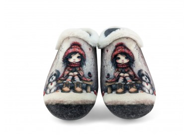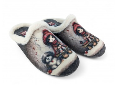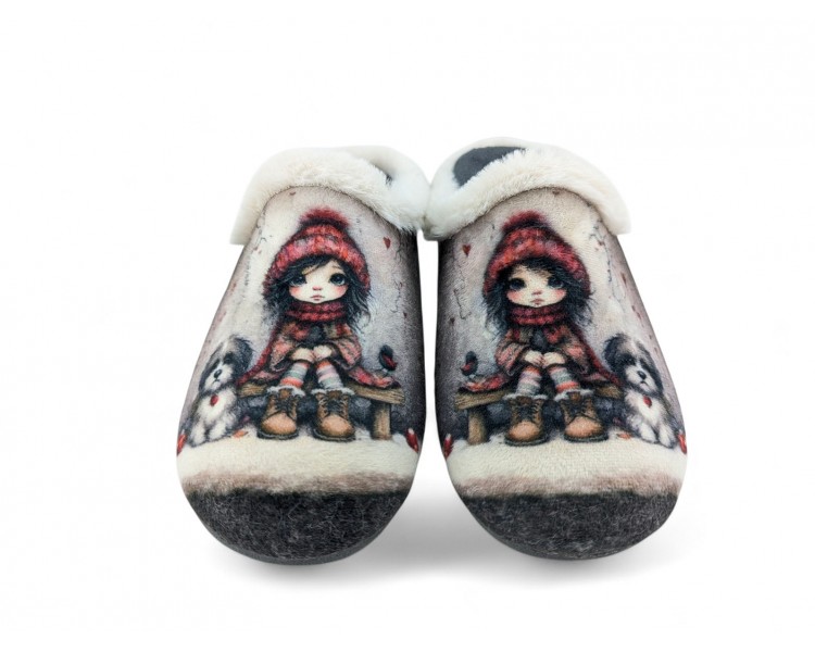 Comodísima zapatilla de andar por casa descalza para mujer y joven. Realizada en textil muy suave y aterciopelado con forro textil afelpado y suela flexible y antideslizante. Ribete de pelo. Motivo en pala de chica acompañada de un perro y fondo de corazones. Plantilla extraíble. Fabricado en España por la marca Gema García.