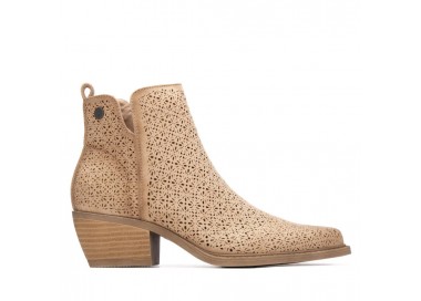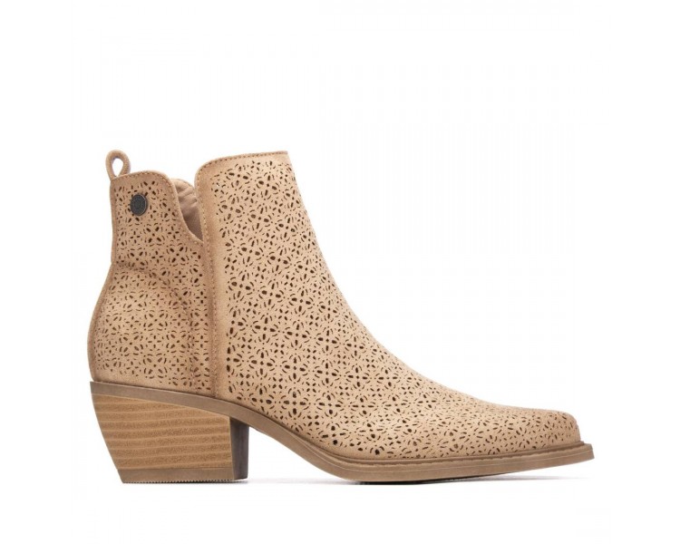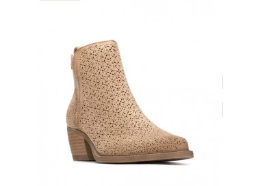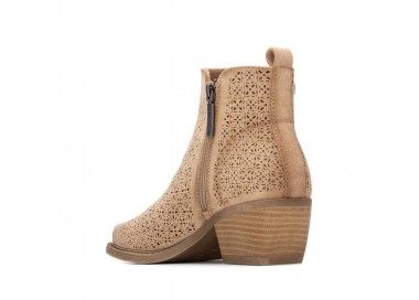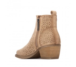 Botín de mujer, marca Refresh. Fabricado en antelina con troquel decorativo. Cierre mediante cremallera interior. Tirador trasero decorativo. Cómodo tacón acabado en madera con suela de goma. Este modelo ha obtenido el certificado vegano por la organización mundial PETA (Organización de los derechos de los animales).