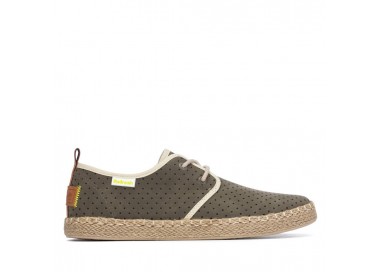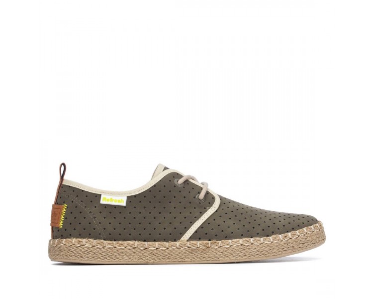 Zapatilla fresca para hombre y joven, realizada en material que imita la piel y forro textil. Cuenta con un discreto bordado en el talón y en el costado exterior el logo de la marca. Plantilla conformada muy acolchada. Se ajusta mediante cordones para que puedas regularlas de forma perfecta a tus pies. Suela de goma con vira forrada de esparto a modo de adorno. Hechas por la marca Refresh.