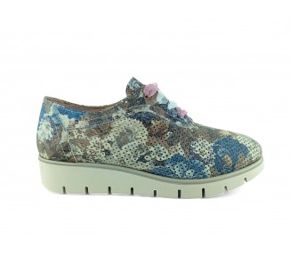 Blucher para mujer, realizado en piel de máxima calidad con efecto camuflaje con toda la pala y costados punteados. Cuña media de gran comodidad. Cierre de cordón central con cuatro ojales. Cuenta con dos tipos de cordones para combinar. Plantilla extraíble en material técnico muy acolchada. Fabricado en España por Nival.