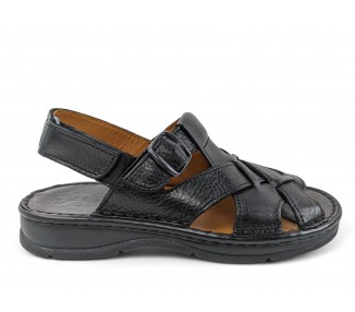 Sandalia de hombre abierta en la puntera y destalonada, formada por la unión entre si de tiras de piel. Cierre de velcro lateral para facilitar el calce del pie y hebilla ajustable para poder abrirlas en el empeine. Es un artículo que se caracteriza por su comodidad y gran calidad, ya que están hechas a mano. Fabricada por la marca Route 83.