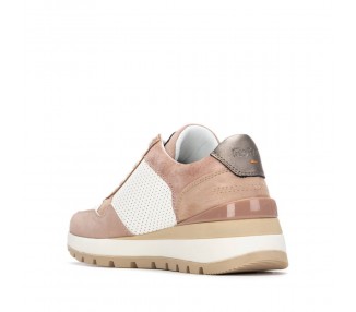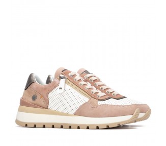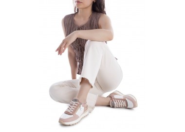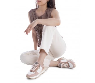 Zapatilla deportiva para mujer y joven, realizada en malla sintética y refuerzo en la cordonera. Cierre de cordones al tono. Boca y lengüeta acolchada aportando más comodidad al pie. Plantilla extraíble muy acolchada. Patín de EVA para mayor ligereza.