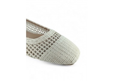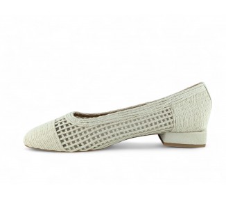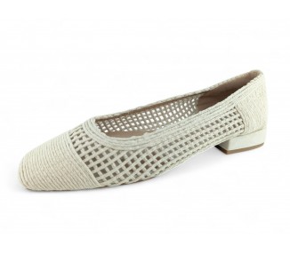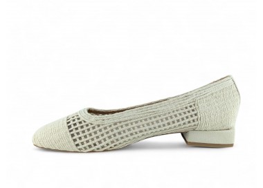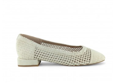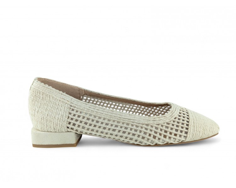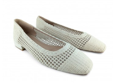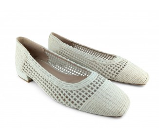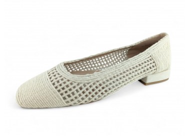 Zapato de salón para mujer color beig totalmente entrelazado en textil y con tacón bajo. Forro vegano. Planta muy acolchada y confortable. Piso flexible. Tacón forrado en ante al tono. Su tacón cuadrado le da una gran estabilidad en la pisada y su diseño hace que este modelo pueda combinar con todos los outfits que te imagines. Fabricado por la marca Buonarotti.