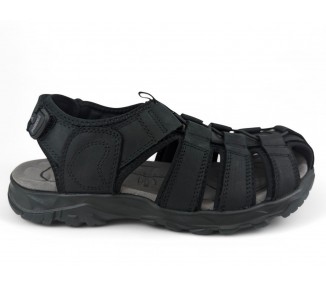Sandalia de hombre y joven de tipo cangrejera, realizada en piel negra con costuras al tono. Cierre de velcro en la parte trasera. Tiene el forro textil y planta anatómica íntegramente técnica que en días de mucho calor transpira más y te aporta una sensación de frescor inigualable. Fabricado por la marca Paredes.