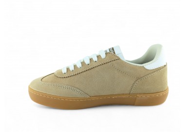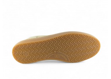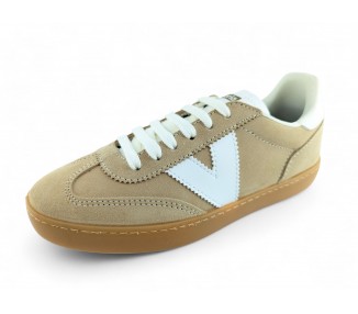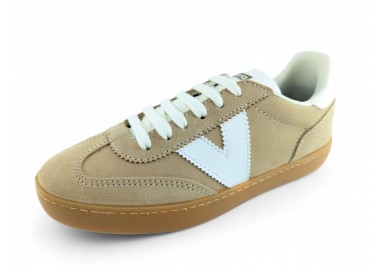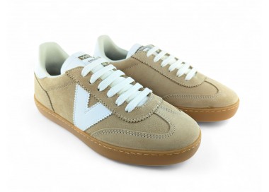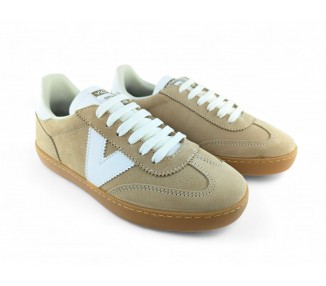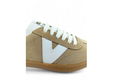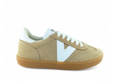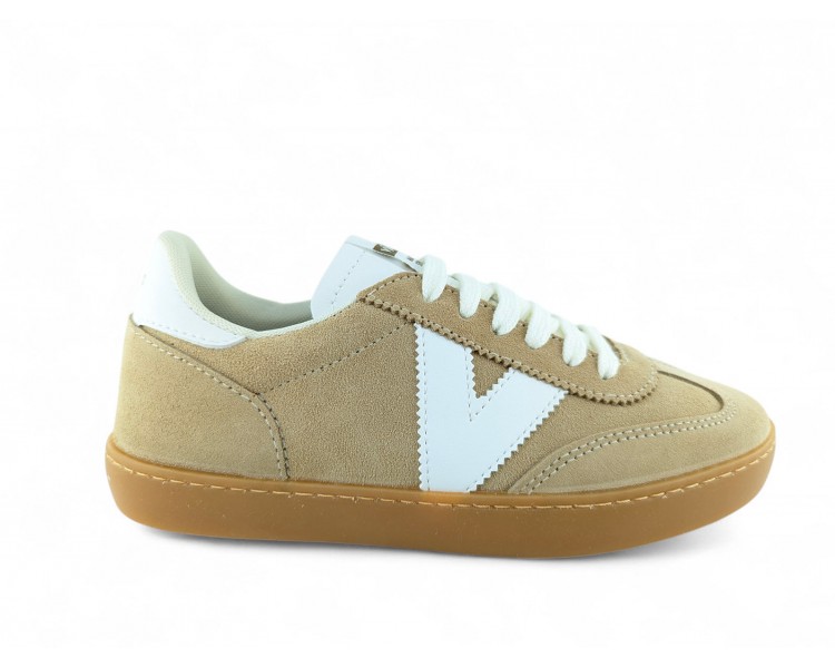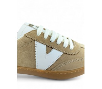 Zapatillas en color beig fabricadas en España en piel y piezas de serraje. Detalle de color en la V del lateral y la trasera, y nuevo corte ciclista en la puntera aportando estilo. Su suela color caramelo aporta un toque de estilo retro. Además, incluyen una plantilla más ergonómica, confeccionada a partir de materiales reciclados, proporcionando un confort superior en cada paso. Fabricado por la marca Victoria.