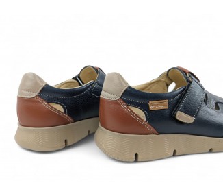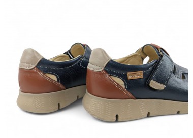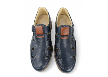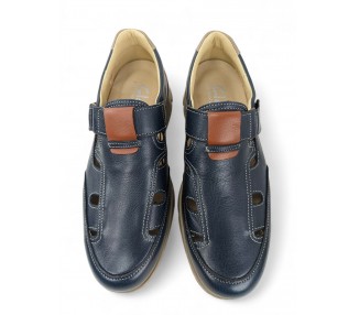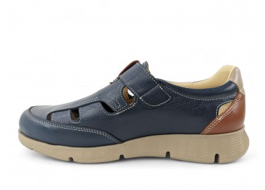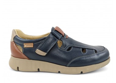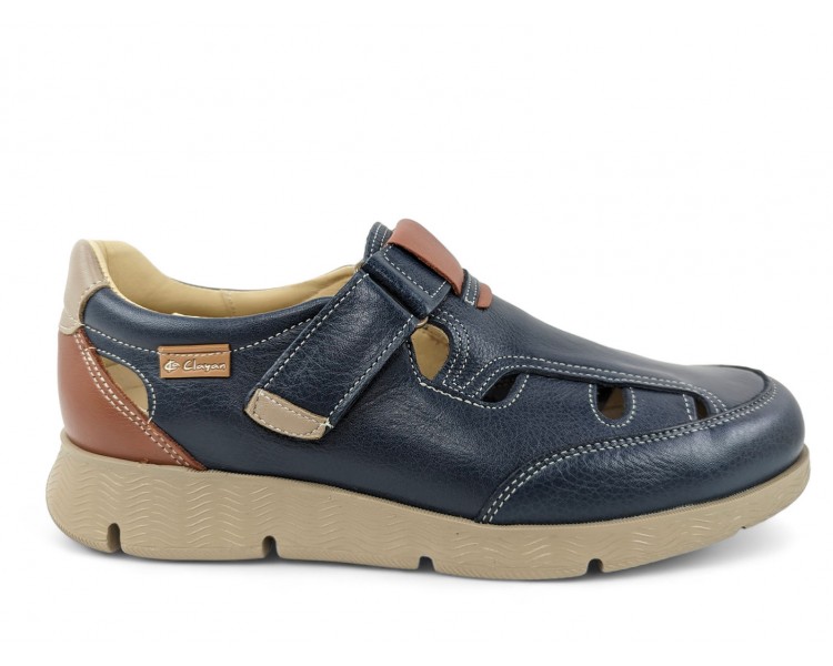 Sandalia cerrada para hombre muy flexible, formada por tiras de piel que nacen de los costados y terminan en el centro de la pala. Hace combinación con piel en color marino en el talón. Plantilla extraíble muy blandita y cierre velcro lateral para facilitar el calce y un buen ajuste del pie. Hecho por la marca Clayan.