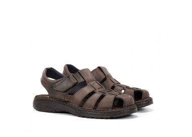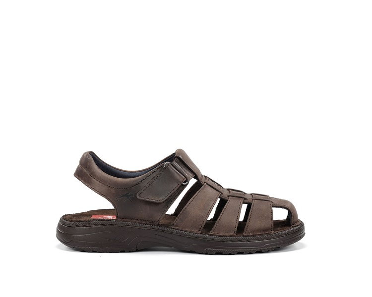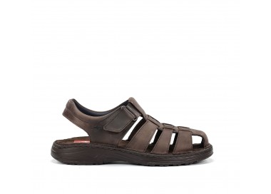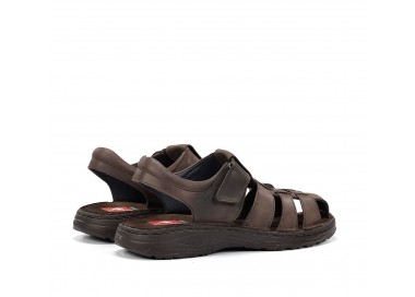 Sandalia de hombre abierta por el talón, formada por tiras de piel entrelazadas y cierre velcro lateral para facilitar el calce del pie. Es un artículo que se caracteriza por su comodidad y gran calidad, ya que esta hecha a mano. Hecho por la marca Fluchos.
