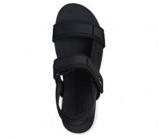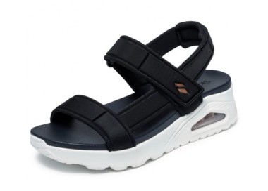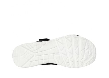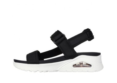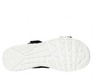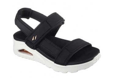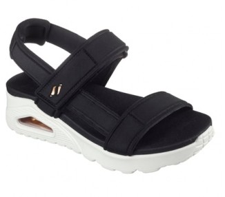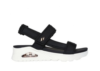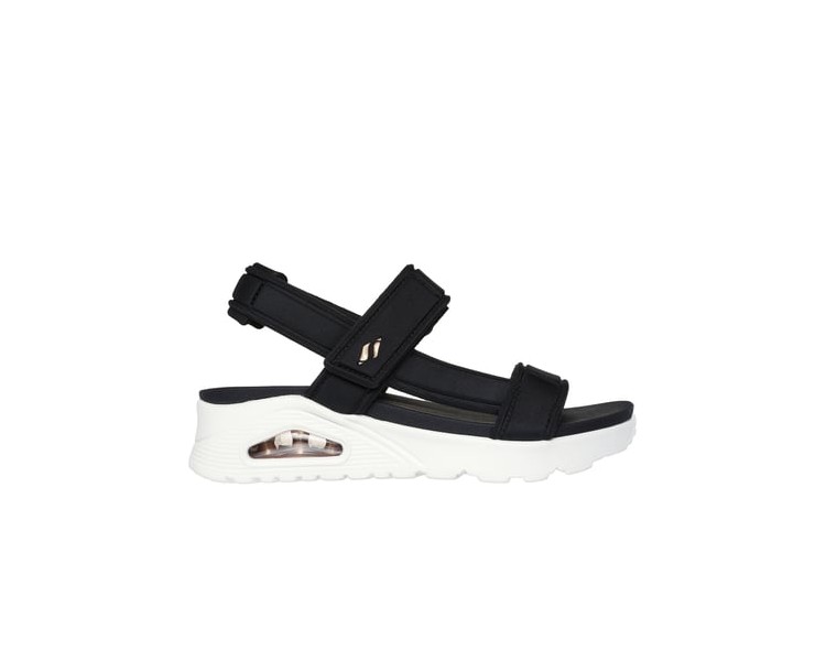 Skechers Uno - Summer Stand2. Estas sandalias veganas con correa en forma de T se inspiran en el emblemático modelo Uno y cuentan con una parte superior sintética de nailon en bajorrelieve con una correa ajustable en el talón. Este modelo también incorpora una plantilla Yoga Foam® con amortiguación y una media suela con cámara de aire visible Skech-Air®.
