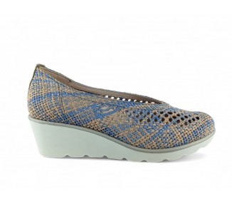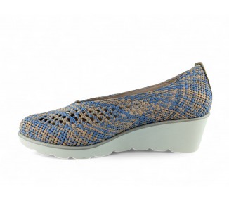 Zapato con cuña para mujer, fabricado con hilo grueso trenzado, con acabado satinado de colores. Copete con cierre en forma de V. Cuña media de 5 cm con plataforma de 2 cm de mínimo peso. Plantilla extraíble realizada en materia técnico muy acolchada. Fabricado en España por la marca Nival.