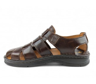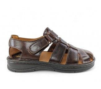 Sandalia de hombre cerrada por el talón y puntera, formada por tiras de piel entrelazadas y cierre velcro lateral para facilitar el calce del pie. Forro y plantilla de piel y gran confort. Es un artículo que se caracteriza por su comodidad y gran calidad, ya que esta hecha a mano. Fabricado por la marca Tamicus.