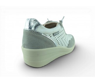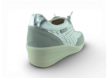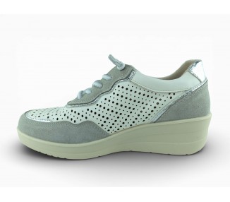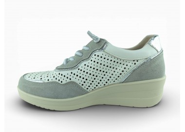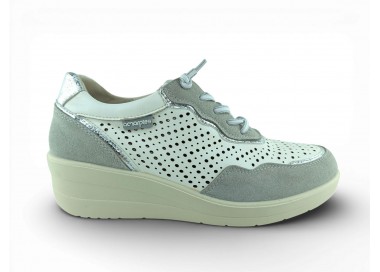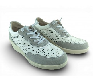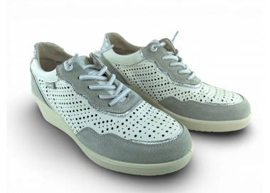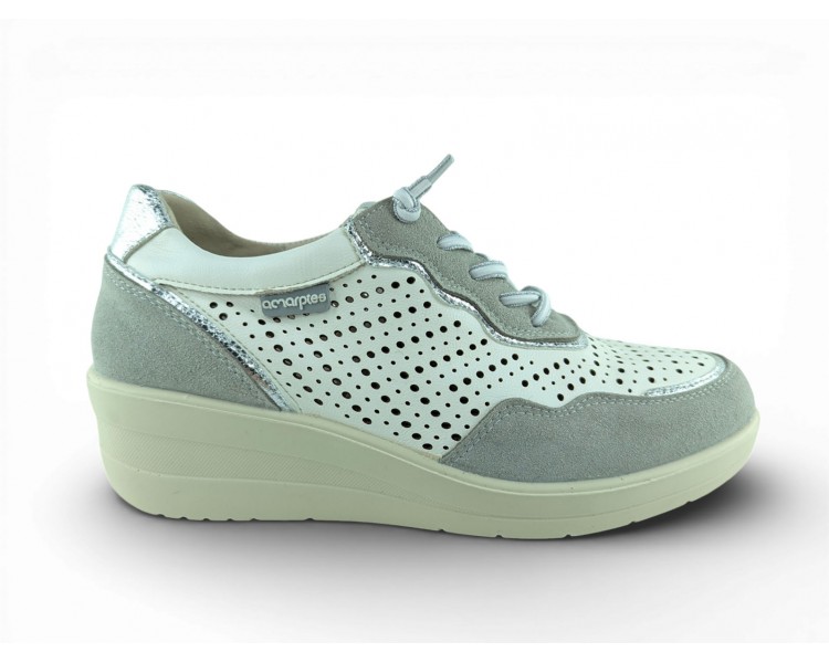 Zapato sport de la marca Amarpies para mujer, realizado en piel ante en combinación con piel satinada perforada para una mayor transpiración, con pequeñas incrustaciones brillantes a lo largo de la cordonera. Plantilla extraíble acolchada “Memory esponge ” que amortigua la pisada y se adapta a la forma del pie y su cierre con cordones elásticos facilita el calce. Modelo cómodo pensado para un uso diario combinable con varios estilos.