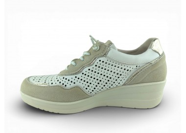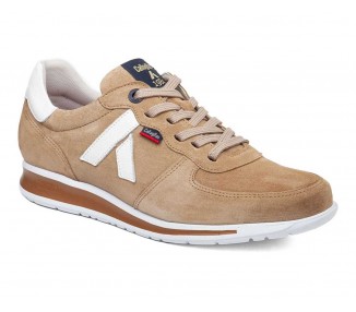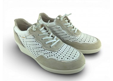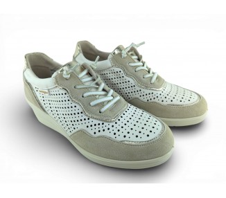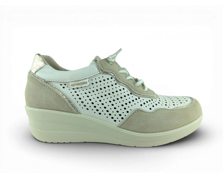 Zapato sport de la marca Amarpies para mujer, realizado en piel ante en combinación con piel satinada perforada para una mayor transpiración, con pequeñas incrustaciones brillantes a lo largo de la cordonera. Plantilla extraíble acolchada “Memory esponge ” que amortigua la pisada y se adapta a la forma del pie y su cierre con cordones elásticos facilita el calce. Modelo cómodo pensado para un uso diario combinable con varios estilos.