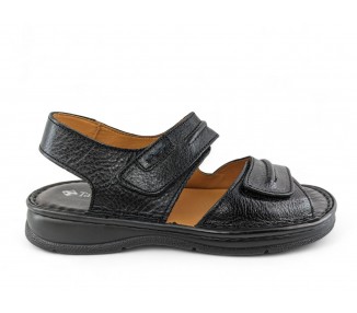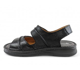 Sandalia de hombre abierta en la puntera y destalonada, formada dos tiras de piel y cierre velcro lateral en cada una de ellas para facilitar el calce del pie. Es un artículo que se caracteriza por su gran apertura de ancho, comodidad y gran calidad, ya que esta hecha a mano. Fabricado por la marca Tamicus.