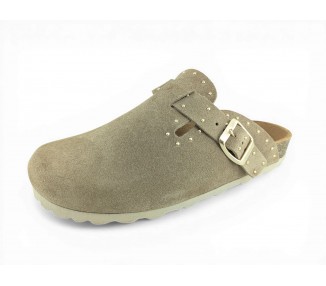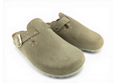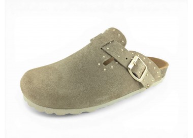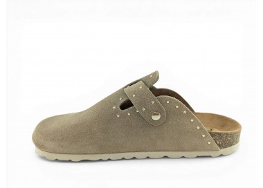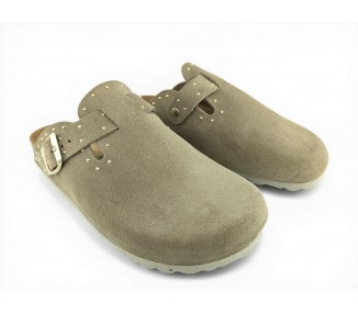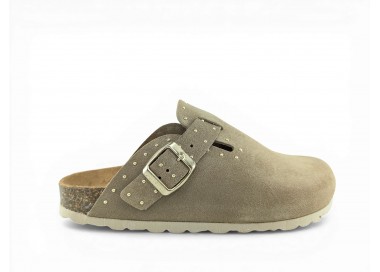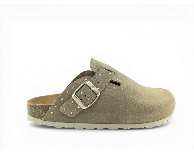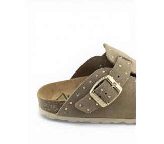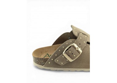 Sandalia Bio tipo zueco para mujer y joven, fabricada en piel serraje de máxima calidad con toda la pala cubierta y cierre de hebilla ajustable en el empeine. Detalle de tachas metálicas en todo el perímetro. Disfruta de comodidad extra con la planta Bio de piel serraje acolchada de gran confort y transpirable. Podrás usarlas todos los días y también para casa. Fabricado por la marca Autenti.