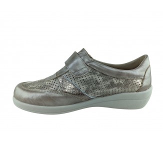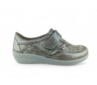 Zapato para mujer de la marca Doctor Cutillas, fabricado en piel y combinado en malla licra perforada en tona satinado. Forro interior textil técnico suave al tacto y plantilla conformada extraíble. Calce ANCHO ESPECIAL. Cierre de velcro para un ajuste sencillo al pie. Hecho en España por la marca Doctor Cutillas.