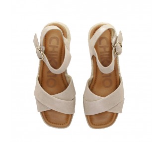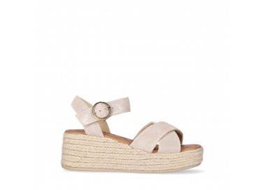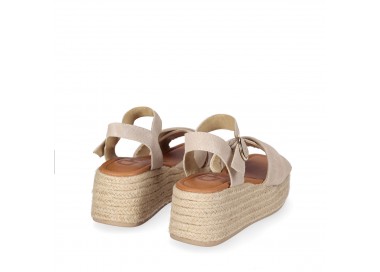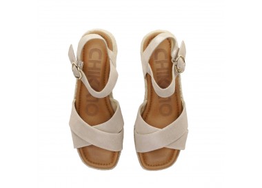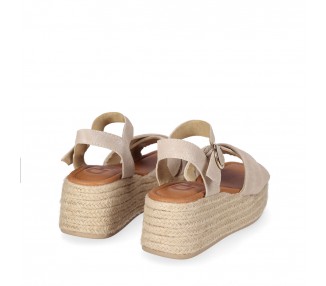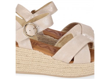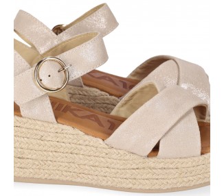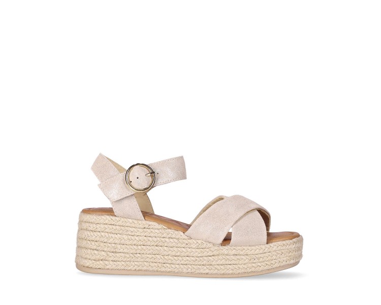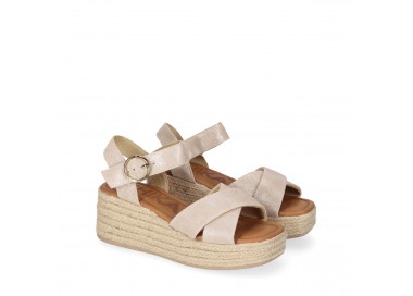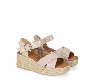 Sandalia para mujer y joven, de pala ancha formada por dos tiras de piel serraje con brillo cruzadas y forradas en material técnico. Cierre de pulsera con hebilla para mejor ajuste al tobillo. Planta de piel acolchada con gel para mayor comodidad. Cuña forrada en yute trenzado. Fabricado por la marca Chika10.