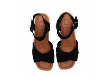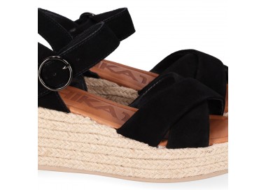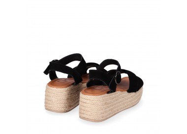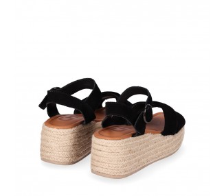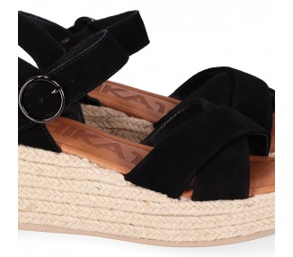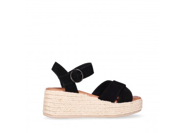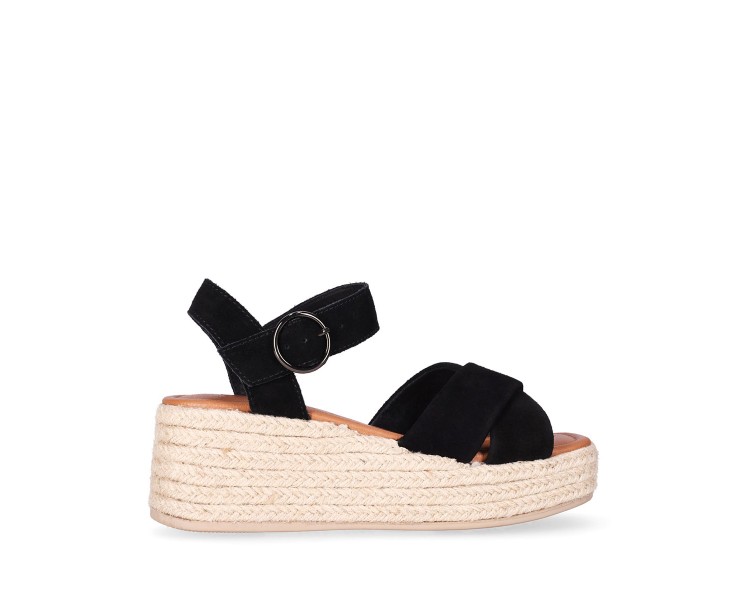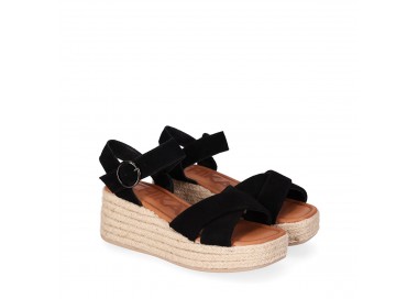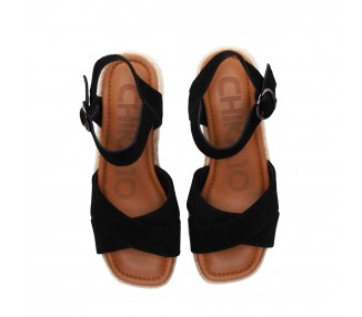 Sandalia para mujer y joven, de pala ancha formada por dos tiras de piel serraje con brillo cruzadas y forradas en material técnico. Cierre de pulsera con hebilla para mejor ajuste al tobillo. Planta de piel acolchada con gel para mayor comodidad. Cuña forrada en yute trenzado. Fabricado por la marca Chika10.