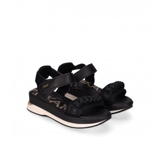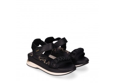 Sandalia para mujer y joven, realizada en piel de primera calidad con tiras entrelazadas y planta de gel de gran comodidad. Cierre mediante hebilla para un perfecto ajuste al pie. Piso de cuña cómoda bicolor. Fabricado por la marca Kaola.
