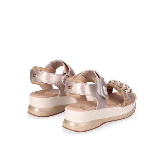 Sandalia de mujer y joven, realizada en piel de máxima calidad con efecto moteado brillo. Cuenta con dos tiras anchas cruzadas entre si y diseño moteado. Tira tobillera con cierre de hebilla regulable. Máxima comodidad con su planta de gel acolchada. Fabricado por la marca Kaola.