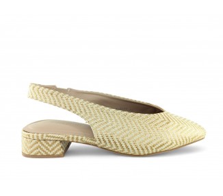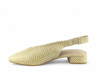 Bailarina de tipo salón destalonada de rafia PU color beig-cuero totalmente trenzada y con tacón bajo. Forro vegano. Planta muy acolchada y confortable. Piso flexible. Tacón forrado al tono. Su tacón cuadrado le da una gran estabilidad en la pisada y su diseño hace que este modelo pueda combinar con todos los outfits que te imagines. Cierre en el talón con un elástico ajustable. Fabricado por...