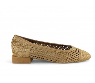 Zapato de salón para mujer color camel totalmente entrelazado en textil y con tacón bajo. Forro vegano. Planta muy acolchada y confortable. Piso flexible. Tacón forrado en ante al tono. Su tacón cuadrado le da una gran estabilidad en la pisada y su diseño hace que este modelo pueda combinar con todos los outfits que te imagines. Fabricado por la marca Buonarotti.