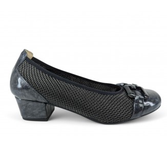 Zapato de tipo salón Ancho Especial de mujer, fabricado en combinación de textil y piel charol, forro interior textil elástico y plantilla extraíble para una mayor higiene. Detalle de cadena en el empeine a moco de adorno. Tacón forrado al tono con una altura ideal. Piso de goma antideslizante. Fabricado por la marca Doctor Cutillas.