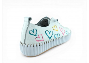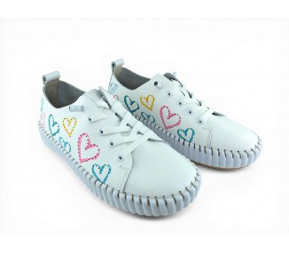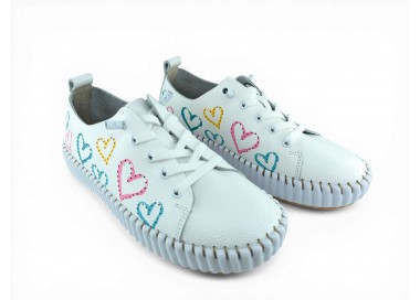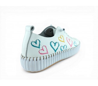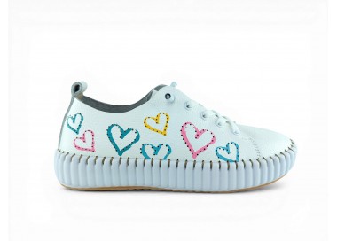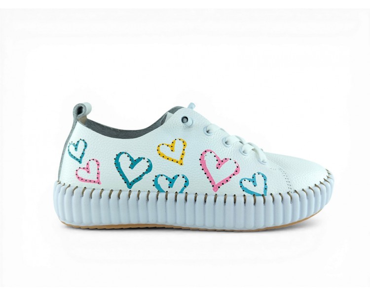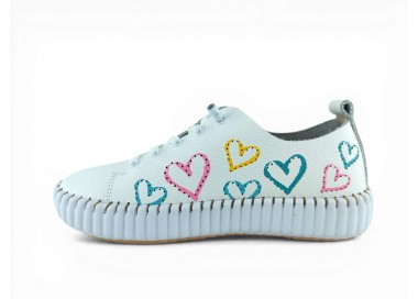 Zapatos de piel bombeada con diseño de serigrafía en color con perforaciones que aporta ligereza y transpirabilidad. Destacan sus acabados troquelados con forma de corazones y el cierre de cordones elásticos que asegura un ajuste cómodo y rápido. Ideales para sumar estilo sin renunciar a la comodidad. Fabricados por la marca The Happy Monk.