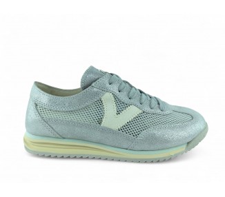 Sneakers para mujer fabricadas en tejido tipo malla con piezas superpuestas de serraje metalizado. V de victoria lateral en efecto piel blanca en contraste. Suela bicolor de goma con patín dentado de EVA en blanco. Hechas por la marca Victoria.