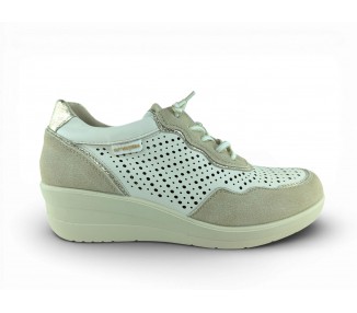 Zapato sport de la marca Amarpies para mujer, realizado en piel ante en combinación con piel satinada perforada para una mayor transpiración, con pequeñas incrustaciones brillantes a lo largo de la cordonera. Plantilla extraíble acolchada “Memory esponge ” que amortigua la pisada y se adapta a la forma del pie y su cierre con cordones elásticos facilita el calce. Modelo cómodo pensado para un...