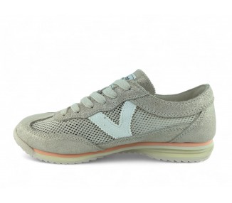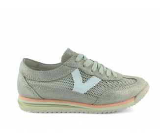 Sneakers para mujer fabricadas en tejido tipo malla con piezas superpuestas de serraje metalizado. V de victoria lateral en efecto piel blanca en contraste. Suela bicolor de goma con patín dentado de EVA en blanco. Hechas por la marca Victoria.