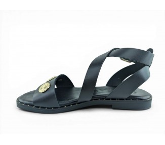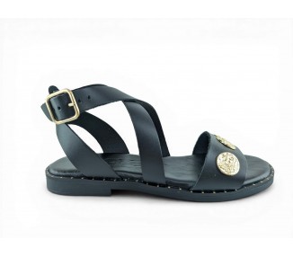 Sandalia de mujer y joven, de la marca Kaola. Fabricada en piel lisa de alta calidad. En la pala cuenta con monedas de tipo decorativo. Modelo de estilo romana con cierre de hebilla para un ajuste perfecto en todo el pie. Detalle de tachas doradas pintadas en la vira. Suela de goma antideslizante.