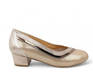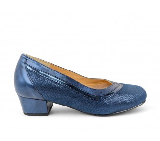 Zapato de corte salón Ancho Especial para mujer. Combinado en material textil texturizado con cortes en piel lisa brillante y mate. Forro interior textil y plantilla extraíble acolchada de gran comodidad. Tacón bajo, ancho y cómodo. Fabricado por la marca Doctor Cutillas.