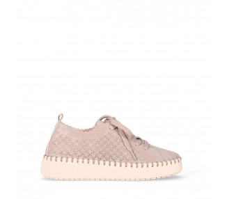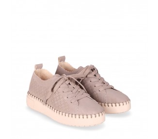 Sneakers beige con una construcción mix de materiales y suela ligera de Eva con detalle forrado en yute. Plantilla muy acolchada. Cierre de cordones. La hilatura de los tejidos que utilizamos en la fabricación del forro de este modelo tiene el sello de garantía certificada Global Recycled Standard (GRS). Hecho por Gioseppo Woman.