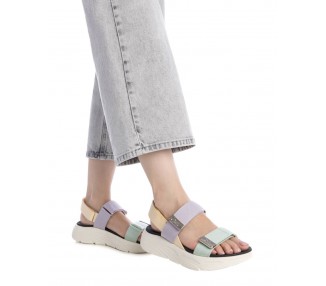 Sandalia de mujer y joven de la marca Xti. Fabricada en material textil-sintético. Modelo de doble pala con cierre de velcro adhesivo y detalle metálico. Tambien cuenta con un trecer cierre de velcro en el talón. Suela deportiva y antideslizante. Este modelo ha obtenido el certificado vegano por la organización mundial PETA (Organización de los derechos de los animales).