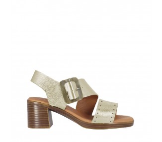 Sandalia para mujer y joven con tacón cómodo realizada en piel bombeada de primera calidad. Cierre con una bonita hebilla en el empeine para un perfecto ajuste al pie. Detalle de pequeñas tachas doradas en la tira de la pala. Planta de gel de gran comodidad. Hecho por la marca Chika10.