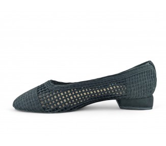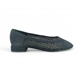Zapato de salón para mujer color negro totalmente entrelazado en textil y con tacón bajo. Forro vegano. Planta muy acolchada y confortable. Piso flexible. Tacón forrado en ante al tono. Su tacón cuadrado le da una gran estabilidad en la pisada y su diseño hace que este modelo pueda combinar con todos los outfits que te imagines. Fabricado por la marca Buonarotti.