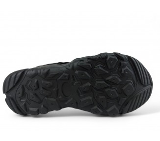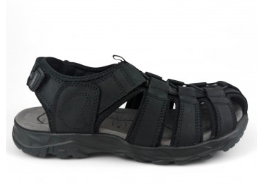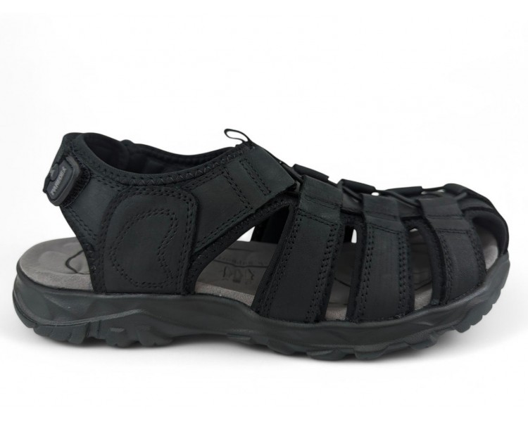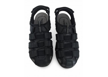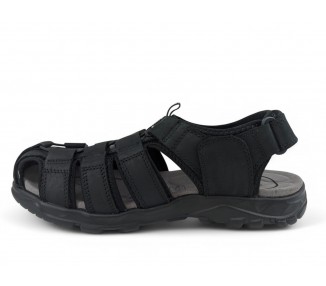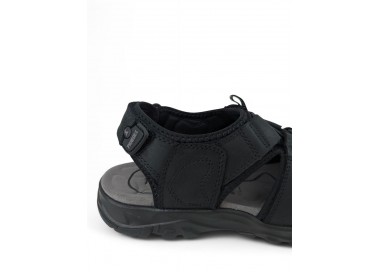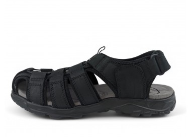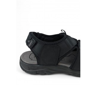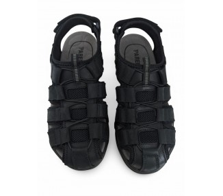 Sandalia de hombre y joven de tipo cangrejera, realizada en piel negra con costuras al tono. Cierre de velcro en la parte trasera. Tiene el forro textil y planta anatómica íntegramente técnica que en días de mucho calor transpira más y te aporta una sensación de frescor inigualable. Fabricado por la marca Paredes.