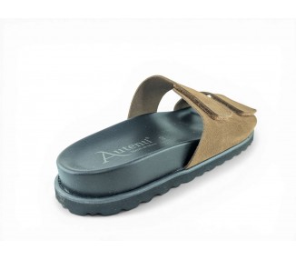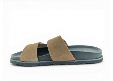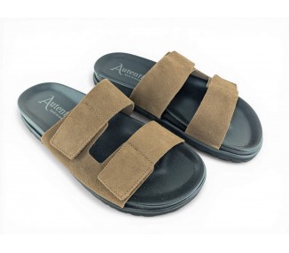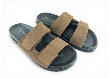 Sandalia de hombre abierta en la puntera y destalonada, formada dos tiras de piel y cierre velcro lateral en cada una de ellas para facilitar el calce del pie. Es un artículo que se caracteriza por su gran apertura de ancho, comodidad y gran calidad, ya que esta hecha a mano. Fabricado por la marca Tamicus.