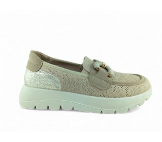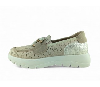 Zapato para mujer y joven fabricado en napa muy suave en tono satinado con picados en formas geométricas. Adorno en pala de herraje metálico dorado y recubierto por hilo grueso al tono. Plantilla y forro en material técnico transpirable. Suela con volumen de EVA que aporta al modelo una gran ligereza. Hecho por la marca Mysoft.